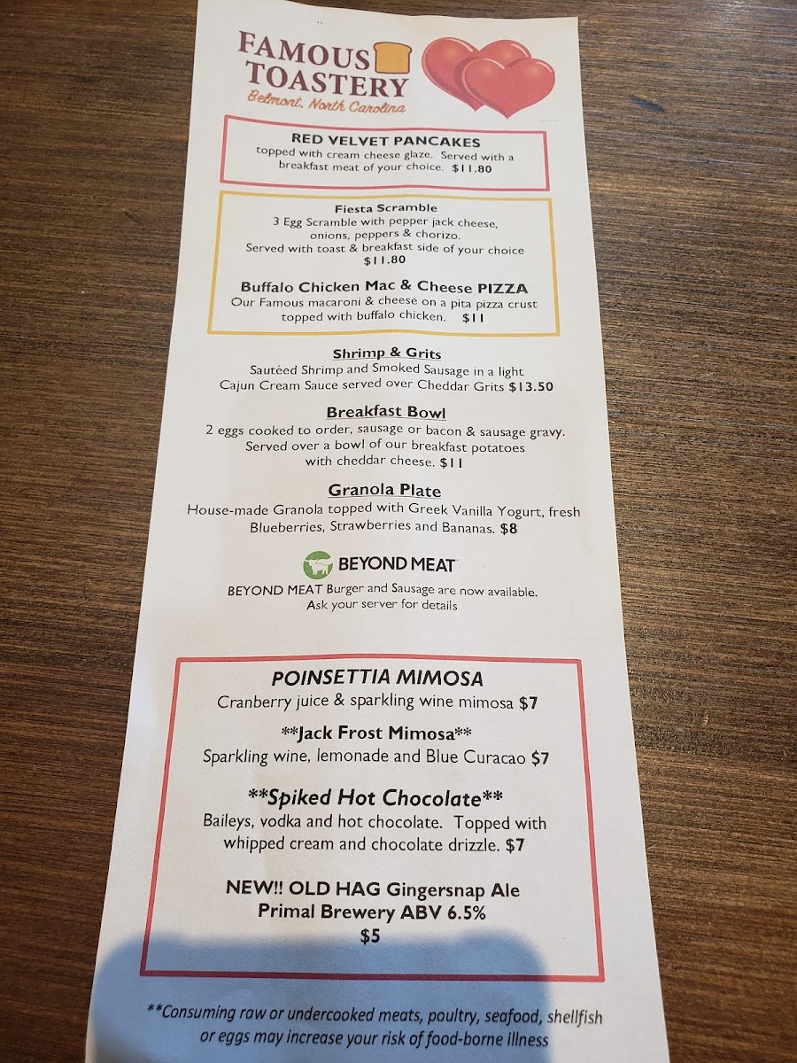 Welcome to Famous Toastery Belmont, a charming breakfast and brunch haven located at 6425 Wilkinson Blvd, Belmont, NC. This spot captures the heart of comfort food while embracing fresh ingredients and innovative flavors. Their menu features a delightful array of dishes, from the classic 2 Egg Breakfast to the flavorful Avocado Omelet, each paired with your choice of toast and sides.